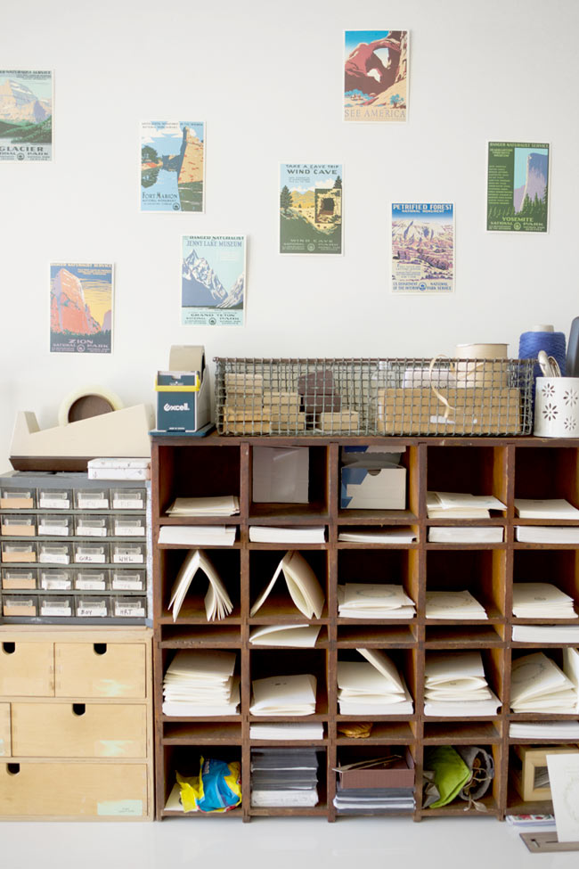 Succulents and smiles abound in Rhonda Dudek’s radiant Providence, Rhode Island studio. Located in PVD’s West End, where creatives have transformed shuttered mills and factories into workspace lofts, Rhonda designs and assembles her nature-inspired jewelry (when she’s not traveling the country). Vintage US National Park postcards adorn a wall above an antique mail cabinet speaking to her wanderlust and goal to see all 59 of our national treasures (so far she’s been to six!).