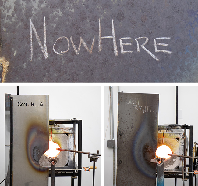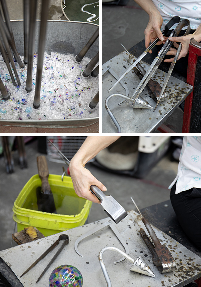 The third essential tool is a pair of jacks. Working with glass is funny, because unlike clay, wood, fiber, or so many other materials, you never get to touch it directly with your hands while it is in a malleable state. You must always have a tool acting as you intermediary. While they look nothing like hands, jacks are the closest, most effective and versatile approximation of your hand. A glass blower’s jacks are very personal. Like a pair of shoes, they change over time and are molded by the person who uses/wears them. Our jacks are made by a wonderful tool maker out in Washington State, Jim Moore. Every 7-10 years each pair goes back to Jim for repair and general tlc. Right now we’re in a cycle of sending back one pair at a time –again kind of like shoes, you’re not ready to relinquish all the old ones simultaneously, you want to break in a new pair before giving up the old!