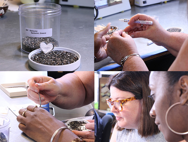 After a tour of her space, I wanted to take a crack at creating my very own piece of jewelry. It was a tough choice deciding which sand to use, but I finally settled on Santorini, a gorgeously grainy volcanic sand with bits of white and terracotta. One of Holly’s sand artists, Mekah, led the way, showing me how to carefully place the sand within the pendant. It’s an exacting process which requires a fair bit of precision. Mekah was a super patient instructor, and within about an hour, I had made a piece of jewelry!