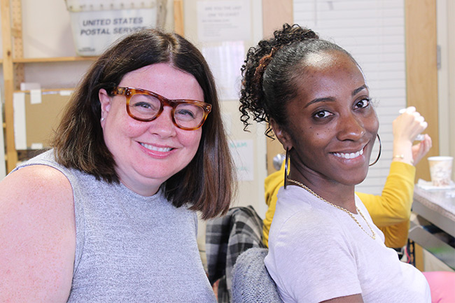Holly and her team work in a converted manufacturing building outside of Boston. The space is a designer’s dream—hardwood floors, sky high ceilings, and lots of light. Her team was warm and welcoming, and the studio buzzes with creative energy. Besides her sandbank, a highlight of the tour was seeing the very table Holly launched her business from—formerly her dining room table, now in use in her conference room.
