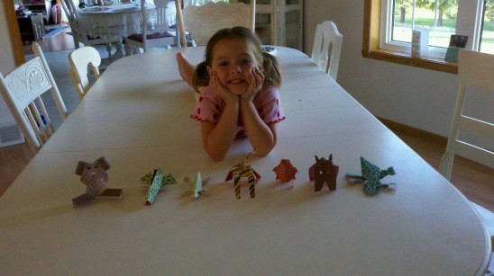 Our paper folding project was a success! Although Kaitlyn was a little too young to fold all of the animals herself (she is 4 1/2, the recommended age is 6+), she had fun folding the simpler designs and she loved playing with the completed critters.