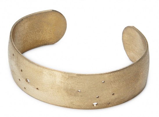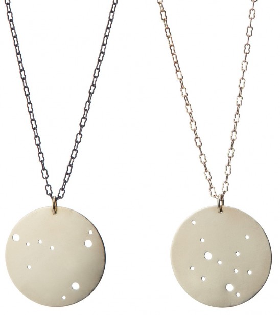 Brooklyn artist Julie Nolan gave a Swiss astrology calendar from the 1900s a modern update when she hand-stamped the constellation patterns in bold brass and created beautiful jewelry. The larger holes represent brighter stars, making a seemingly abstract pattern that actually symbolizes your astrological sign.