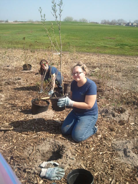 Cassie shows off a fine tree while Julia pats down some fresh soil.