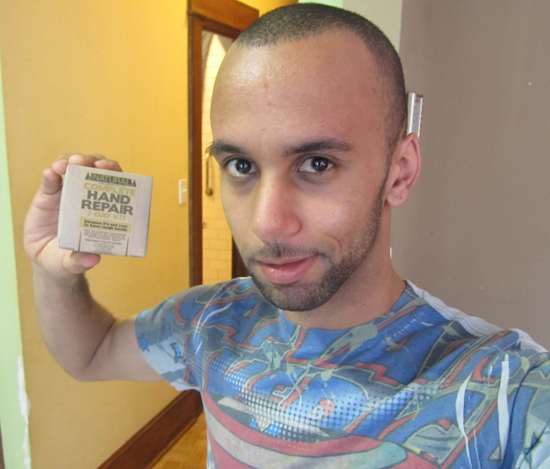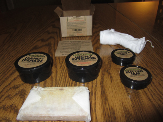 I figured that Monday morning would be a good day to start this experiment. I opened the kit, which includes soap, hand repair lotion, knuckle wax, night salve, cotton gloves and butter nub along with instructions.