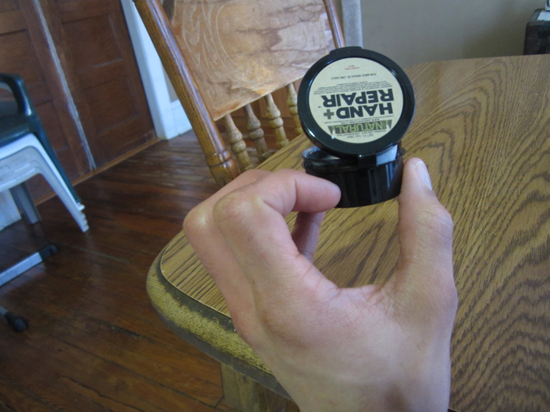 The butter nub, which has skin healing oils and is meant for on-the-go moisturizer, took a bit of extra effort to get out of the container as it was of a more solid consistency. My wife described the smell of it as similar to shea butter, although it definitely seemed harder than the night salve. Throughout the seven days of hand repair, I used the butter nub in an attempt to moisturize my hands while at work and home.