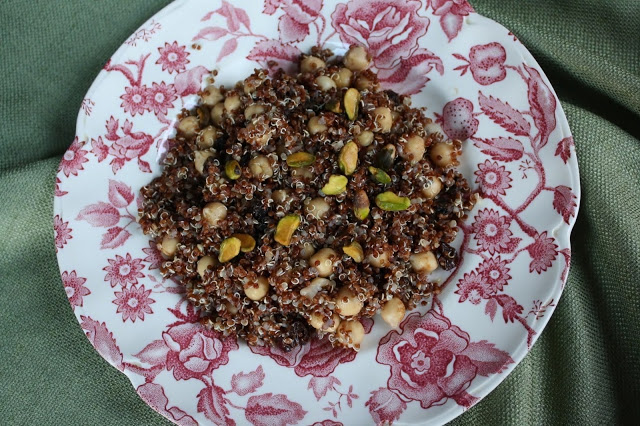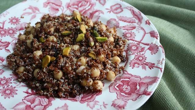 After doing a lot of research into couscous substitutes, Caitlin realized that quinoa would make a great component in her own couscous-inspired dish. What she came up with might not be traditional, but it is a lightly-spiced and very delicious gluten-free alternative. This recipe features hearty chickpeas, sweet raisins, and crunchy pistachios for optimal end-of-summer enjoyment.
