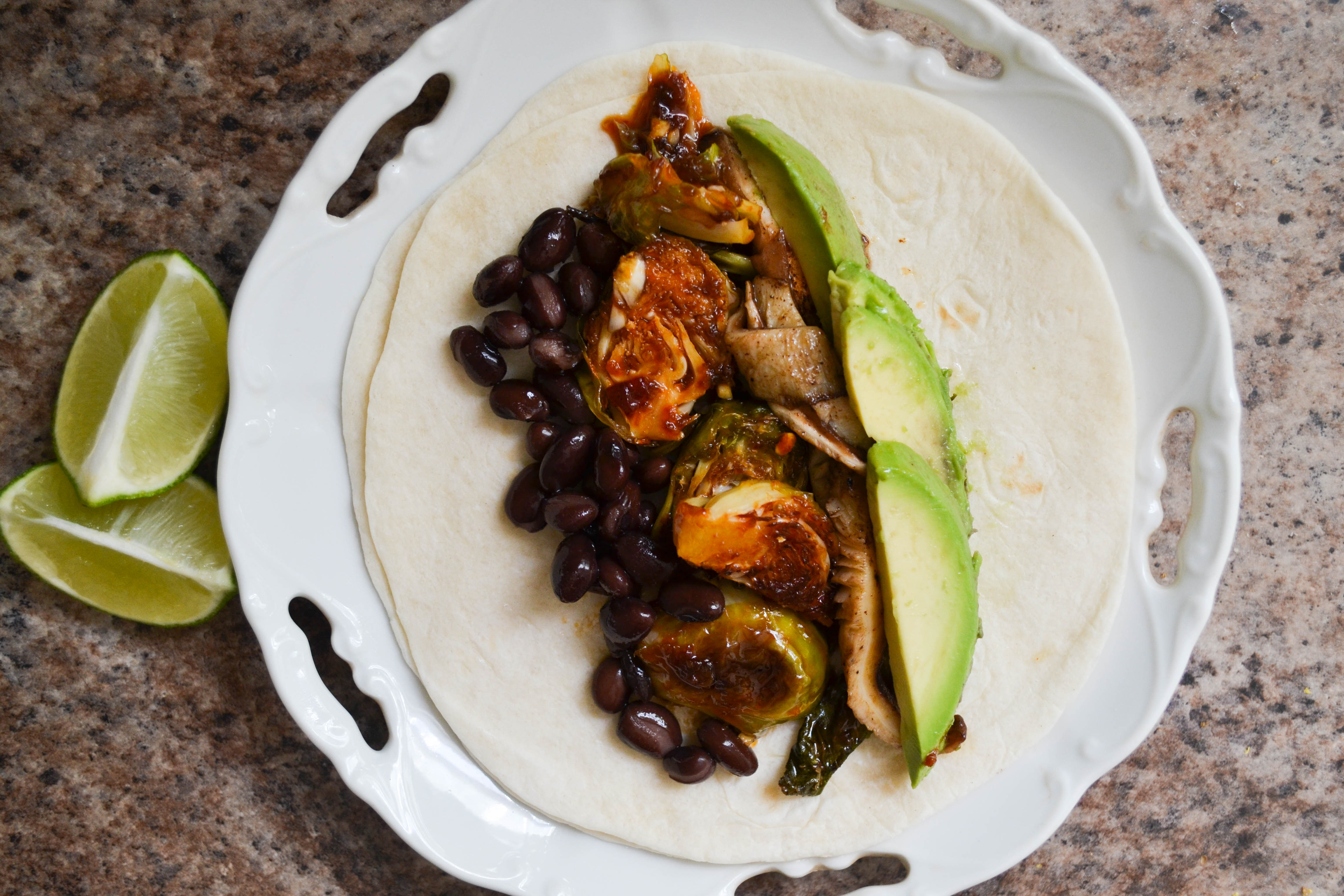Heat 1 tablespoon vegetable oil in a skillet and add the shiitakes. Sauté for 2-3 minutes, then stir in chili powder and juice of half the lime. Remove from heat and assemble tacos with brussel sprouts, shiitakes, sliced avocado, black beans and remaining lime juice.