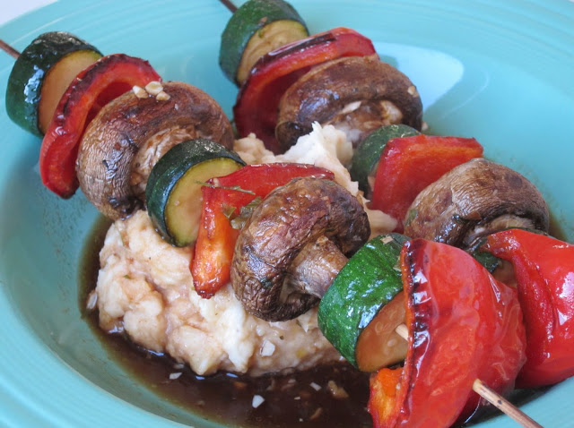 Thread the vegetables on the skewers, baste with the olive oil, and grill on the BBQ or broil on the middle rack of oven. This recipe serves 4.