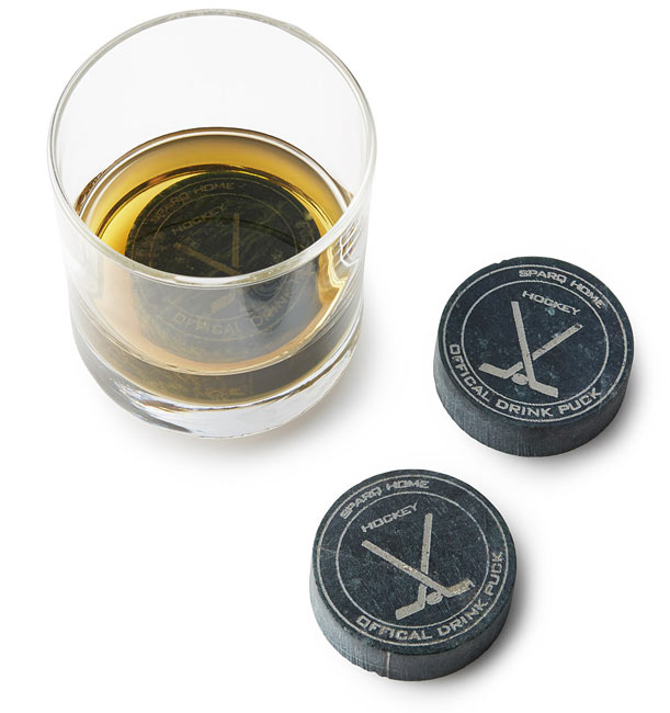 When it comes to chilling your cocktail, it’s always good to avoid icing. Simply freeze these recycled soapstone pucks and place them in your drink to chill it without an unwanted slap shot of water. | Hockey Puck Chillers