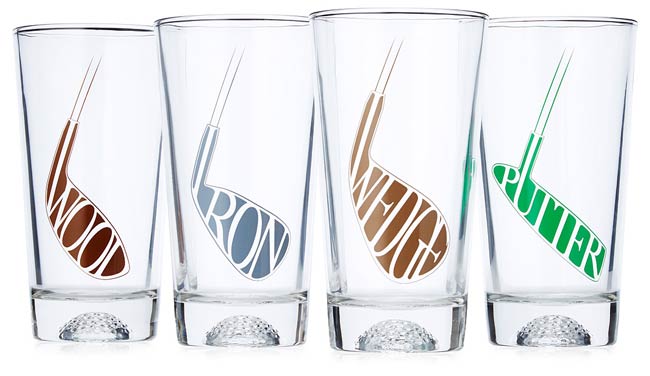 Tee up your favorite beverage in these tumblers featuring golf ball impressions in the base and four familiar kinds of clubs. The set makes a hole-in-one gift for anyone who enjoys a clubhouse cooler or a cold one while watching a TV tournament. | Set of Fore! Golf Glasses