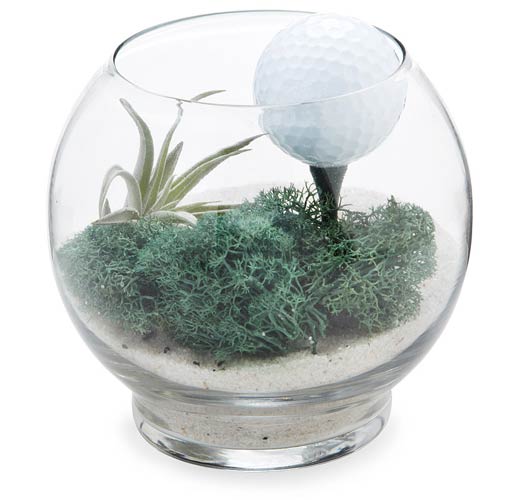 This desktop oasis is a miniature tableau of a golf-lovers’ view of nature—a picturesque backdrop for a golf ball ready to tee off from a fairway of living reindeer moss and air plants. | Tee Time Terrarium