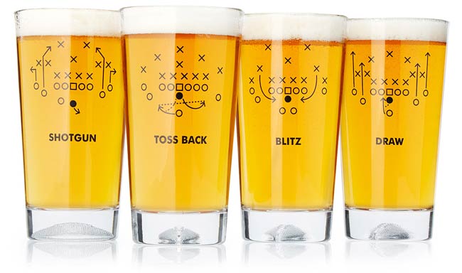 Printed with diagrams of classic football plays, these glasses give shotgun, toss back, blitz, and draw new meaning as fun drinking terms. Football impressions in the base of each glass add an extra point of design delight. | Football Playbook Glasses