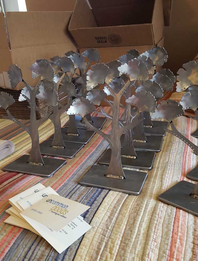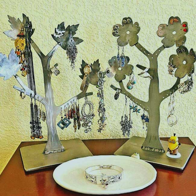 I can honestly say we are still growing and don’t really have a “typical” day just yet. I like to have most of our items in stock so they can be shipped out as soon as possible. If they can’t be fully assembled, then they’re usually partially done awaiting customization of some type. My husband does the metal work for our trees and recycled metal items. So, he might be out in the garage cutting, grinding and welding up several items at once. I can be found making earrings or custom necklaces, or if I’m in the painting mood, creating ornaments or little gift paintings. The creative part of the business–because it’s the most enjoyable–doesn’t seem to take as long. Doing the photography takes me the longest so I’ll sometimes wait to list items and do a bunch of photos all at once, then edit and create listings.