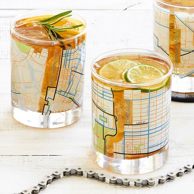If their favorite mode of travel is their trusty ten-speed, this set of glasses is just the right gift. | City Bike Map Glasses