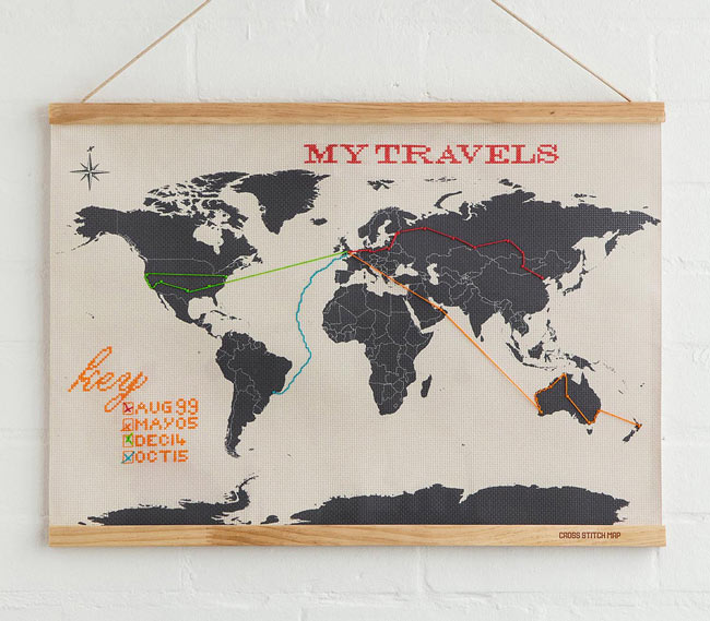 Now your traveling pal can stitch their trips together and always keep them in mind with the help of this map. | Wanderlust Cross Stitch Map