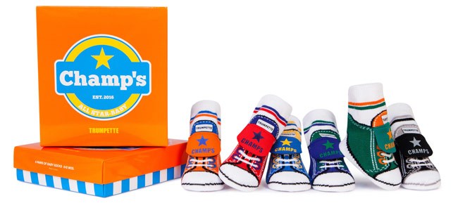 Teensy feet will look cooler than ever in these trompe l’oeil socks designed to emulate classic high tops. | Champ’s Socks – Set of 6