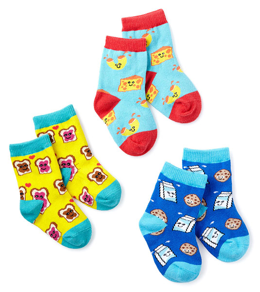 Shroud your wee one’s tootsies in cute renditions of three classic culinary pairings: macaroni and cheese, PB&J, and milk and cookies. (Ugh, now we’re hungry.) | BFF (Best Foods Forever) Socks – Set of 3