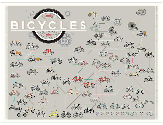 From trikes to tandem bicycles, this colorful chart—the perfect gift for any man who wishes he weren’t too old to hang posters in his bedroom—outlines the nuts and bolts (or should I say chains and spokes?) of two-wheeled history. | Evolution of Bicycles Pop Chart