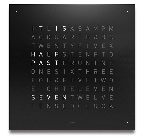A little like a grown-up word search, this elegant clock keeps track of time with the help of illuminated letters and four tiny dots, each symbolizing a minute. | QlockTwo Classic