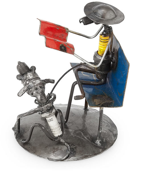 Some caves have paintings. We tend to think that Dad’s could use a recycled tribute to the unbreakable bond between man, pooch, and newspaper, though. | Spark Plug Park Bench Sculpture