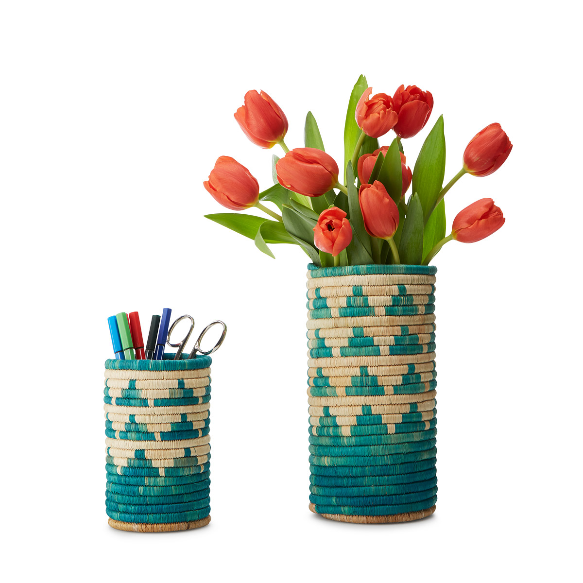 The dune and aquamarine colors of these nesting baskets conjure the texture of the sand and the movement of the sea. Hand-crafted by Rwandan craftswomen, these one-of-a-kind baskets are made from woven sweet grass and work perfectly as a catchall—for your jewelry, a sleep mask or journal, or even treasures from the ocean floor. | Handwoven Nesting Baskets