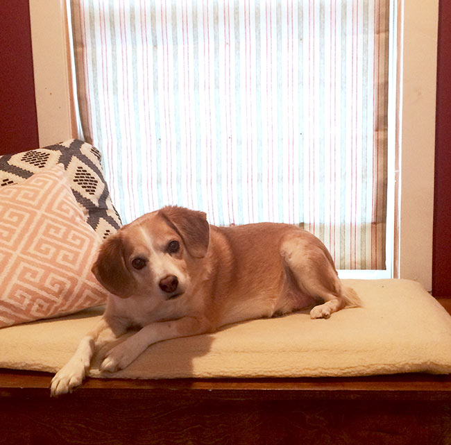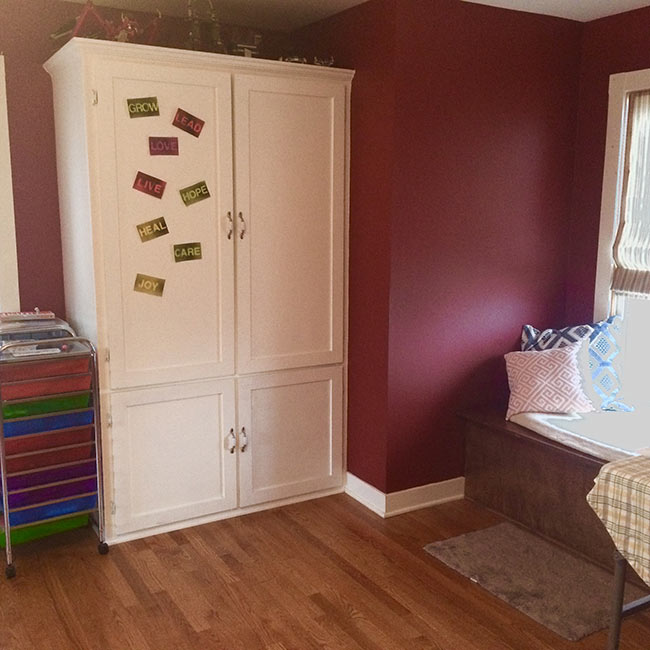 Eliza’s studio is decorated with postcards designed by her sons. Each postcard displays a positive word.