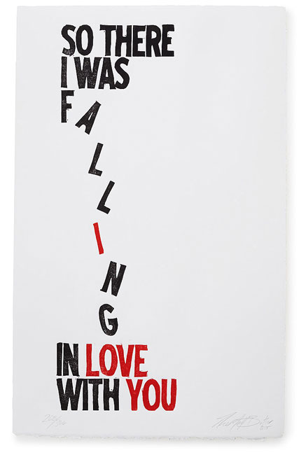 Although Matt Butler’s hand-signed and numbered linoleum cut recalls the sometimes-terrifying excitement of the early days of your romance, its red-tinted letters spell out a definitive declaration of love befitting a first anniversary.