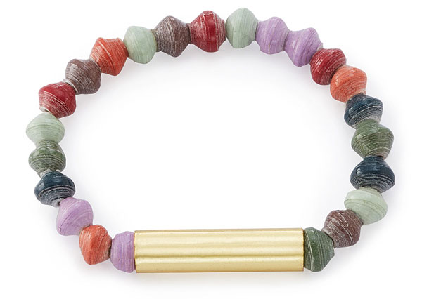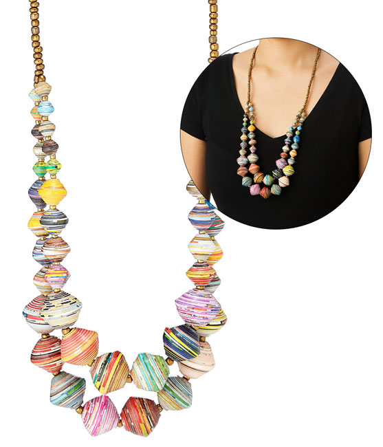 Handcrafted in Uganda, this playful necklace incorporates beads made from colorful, tightly rolled strips of recycled paper, turning the traditional first anniversary gift-giving theme on its head.