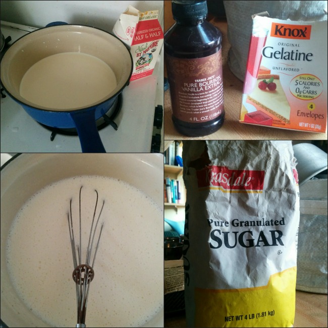 Clockwise from top L: Half-and-half heating on the burner; vanilla essence and unflavored gelatine powder; sugar; heated half and half with the ingredients added.