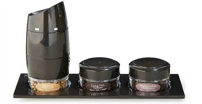 L to R: Interchangeable canisters of Indonesian Muntok, Vietnamese Dong Nai, and Madagascar Voatisperifery peppercorns.