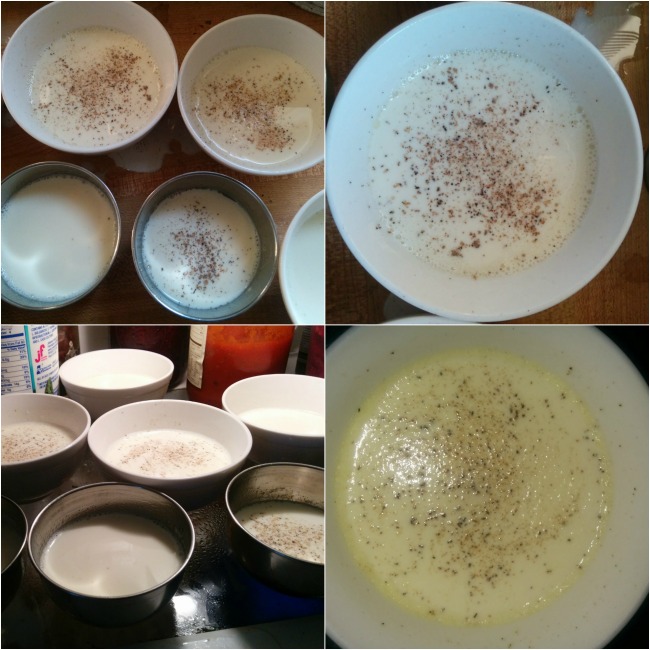 Clockwise from top L: Motley bowls filled with liquid panna cotta mixture – some peppered, some not; closeup of a peppered bowl; closeup of a peppered bowl after solidifying in the fridge; liquid becoming pudding-y in the fridge.