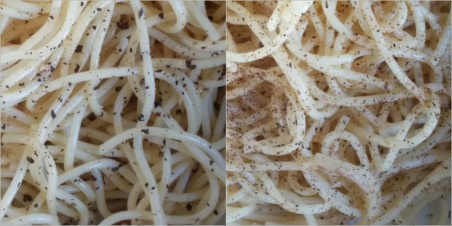 I tested the two mills on some spaghetti. Look at the contrast between pepper ground by my old mill and the new one. The old one doesnt grind evenly, not even a little bit. On some foods, like salads, I like being surprised by a bigger chunk of pepper. But on most dishes, I want both more subtlety, and more control over how much pepper my tongue touches at once.