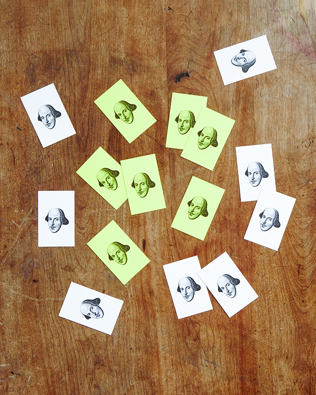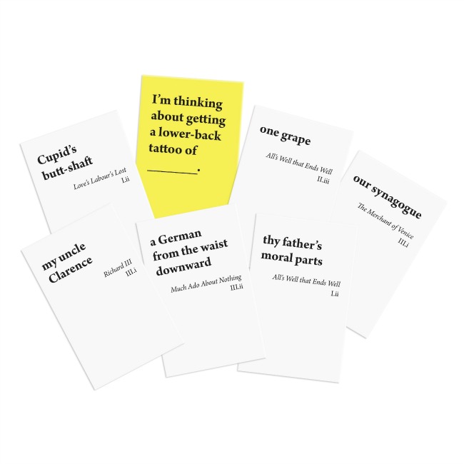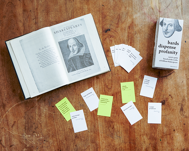 Even if you’ve never played the NC-17 game that inspired it, the rules of BDP are almost intuitive: One player draws a yellow card that offers a playful sentence with a provocative blank (or two), like decidedly adult Mad Libs. The other players choose from their hands of seven white cards containing snippets of Shakespeare, and the “Profanity Judge” (yellow card player) decides which yellow-white card combination is the most amusing, outlandish, or, well, profane. You can usually tell by the degree of beet-red faces and giggling as the white cards are presented.