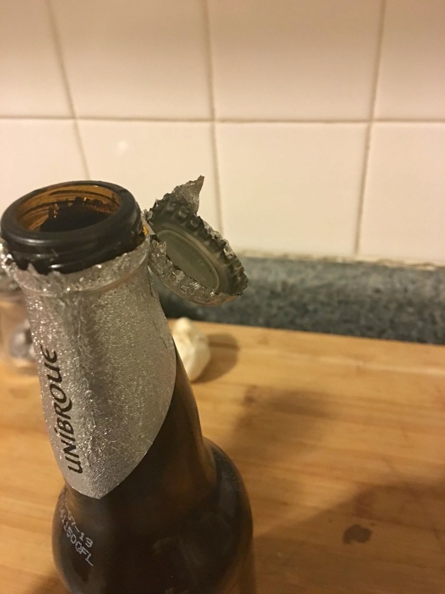I did not plan to test drive the bottle opener as I mostly drink canned Guinness at home and have an opener readily available (other bottles, a lighter, any ledge, corner, etc.). But sometimes, fate intervenes. On my way home from work I ran into a friend on the subway who manages the band Megadeth. He just got back from the release of Megadeth’s collaboration brew with Unibroue and gave me a 4-pack. Where was I? Oh, right–the bottle opener opened the bottle.