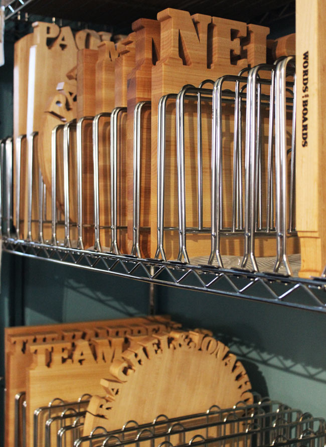 My latest trip started at Penn Station in Manhattan, eaaarly in the morning. A few hours later, I arrived at Penn Station in Baltimore, Maryland, where Kim Strassner was waiting for me and our Tabletop Buyer, NéQuana. Kim filled us in on some neighborhood history as she drove through B-more to the studio, woodshop, and office space where she and her husband, Mike Pararas, design and craft their personalized wooden cutting boards and lazy Susans. It didn’t take long before I realized how much work Kim, Mike, and their team put into each board they produce. The letters in the customized pieces are carved using tiny blades, precise hand movements, and great attention to detail.