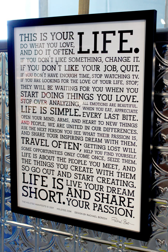 K: The Holstee Manifesto that hangs at the entrance of my workspace. It really just says it all about life and how I want to live my life.