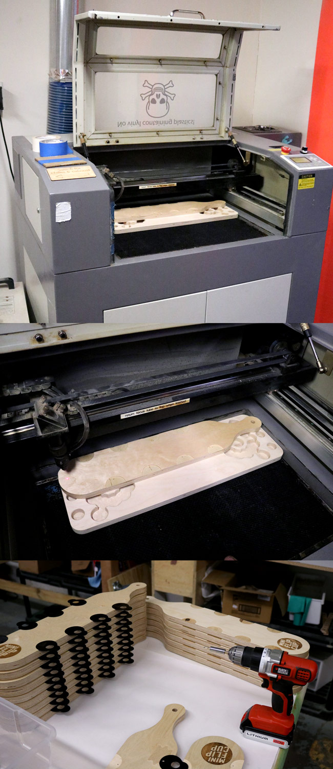 They demo’d a couple of fancy machines for me: a huge CNC (“Computer Numerical Control”) router, which precision-mills their specially-shaped game boards; and a laser cutter, which emits a little red dot—just like the one my cat likes to chase—except it can cut and engrave wood. The Nordeast Maker Space makes these otherwise-unaffordable specialized machines available to small, independent makers like them.
