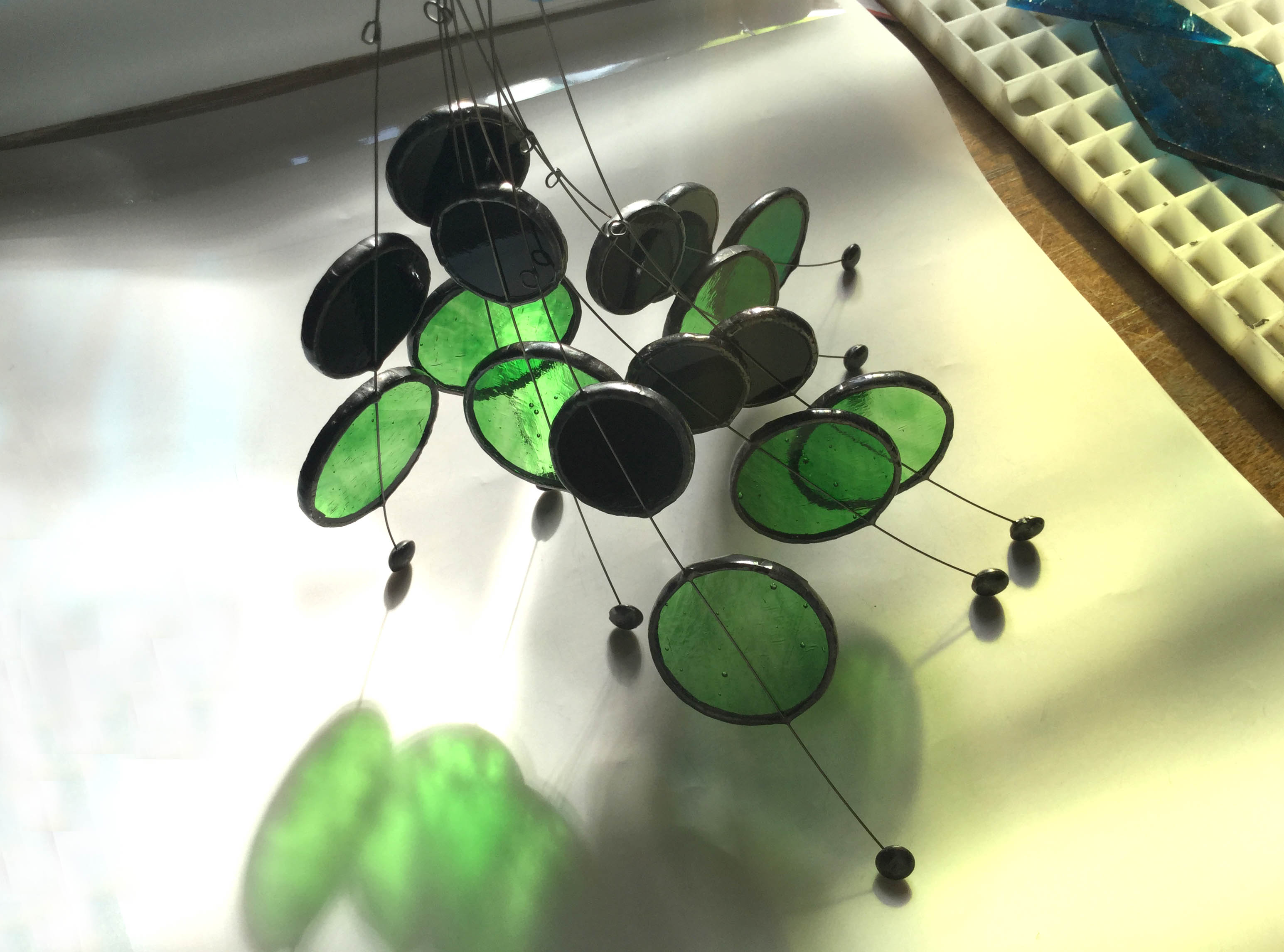 When my two boys leave for school, I take a moment outside to get oxygenated. This ritual marks the beginning of activities that are more physical in the workshop. After, it is the work of glass that begins, according to what project I have to do. I choose the glass according to their colors and their textures, I trace, I cut, and I sand. Most of the time I use the Tiffany technique (copper foil technique) to assemble my parts. This technique involves wrapping the edges of the pieces of glass with a thin sheet of copper before being arranged and welded together.