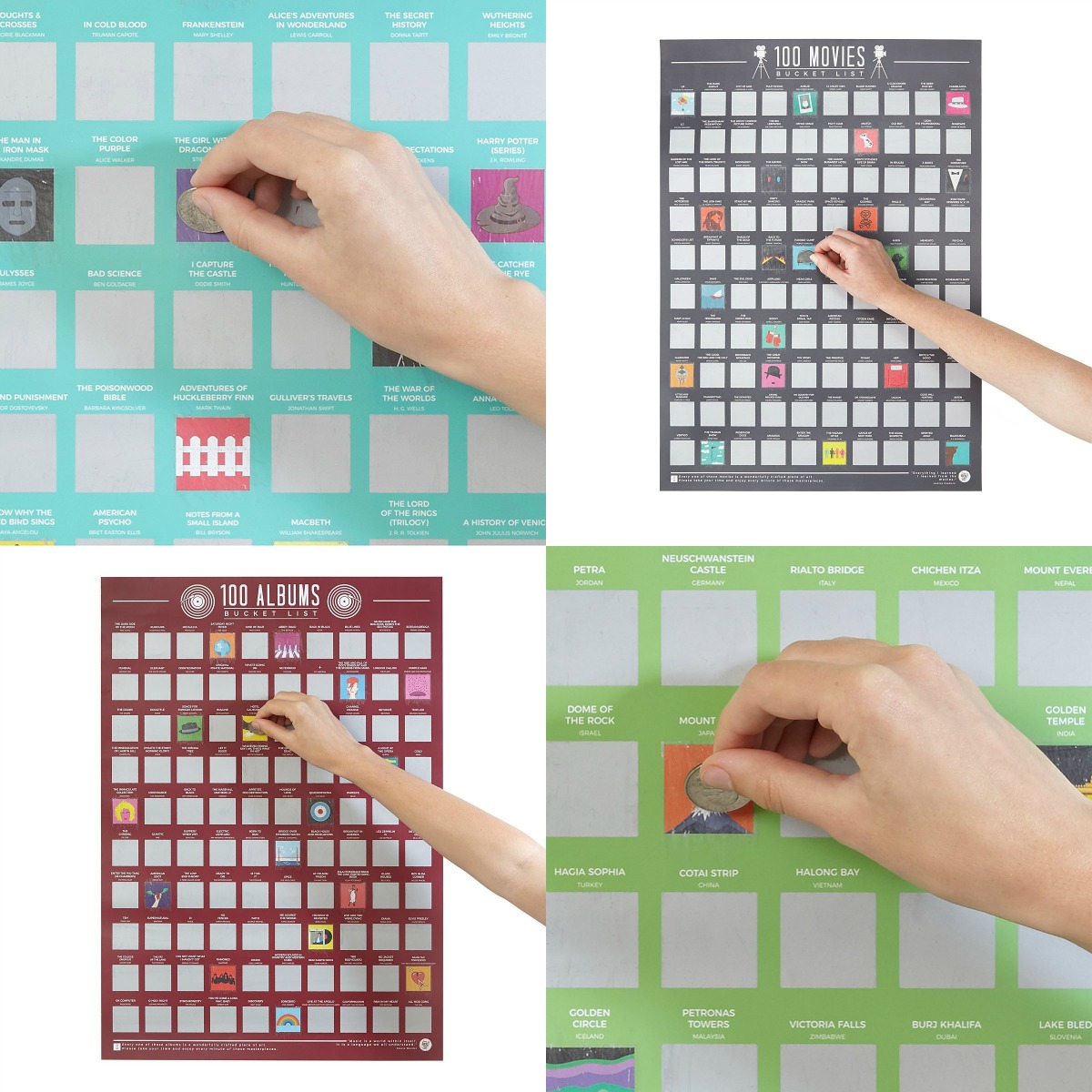 Got a travel, book, film, or music buff on your hands? Challenge them to check off 100 of the classics in their category with an addictively interactive poster.