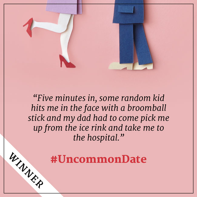 “[W]ent on my first date ever, not first date with this guy, but first date of my entire life when I was a junior in high school. This guy invited me to play broomball at an ice rink with his church youth group. Five minutes in, some random kid hits me in the face with a broomball stick and my dad had to come pick me up from the ice rink and take me to the hospital. I had to get two stitches right above my eyelid and it was the most exciting first date I could ever hope for! That #uncommondate got me a great story and my first boyfriend.”