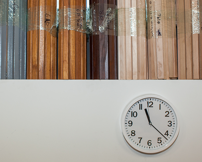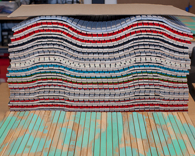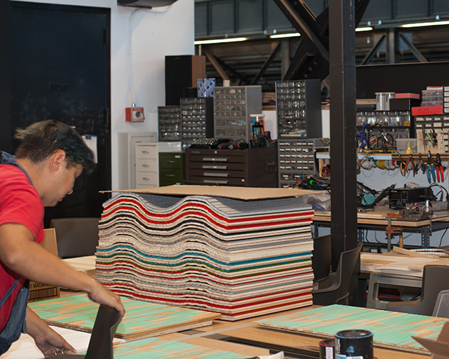 Tambour is a material that has slatted pieces adhered to a backing so it can be flexible. Often in bread boxes or roll-top desks or sometimes screens. The tambour usually bends only in one direction, so it rolls up or down but can’t flip back up the other way. We had to do a modification on a conventional tambour so that ours can go in both directions because it has to follow a contour. We put chamfers on both sides of each slat, so they have an angle that allows them to be able to bend in both directions. Implementing this notion of a tambour meant that we could then play with things that go from flexible to rigid.