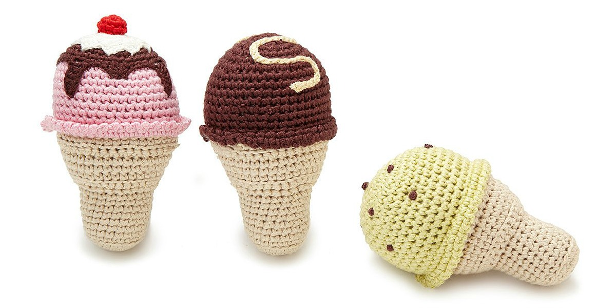 OK, so baby will try to eat these rattles. Little ones learn by putting everything in their mouths, so why not go with it and give them some handmade organic cotton ice cream cones to play with? At least until soft serve is an option.