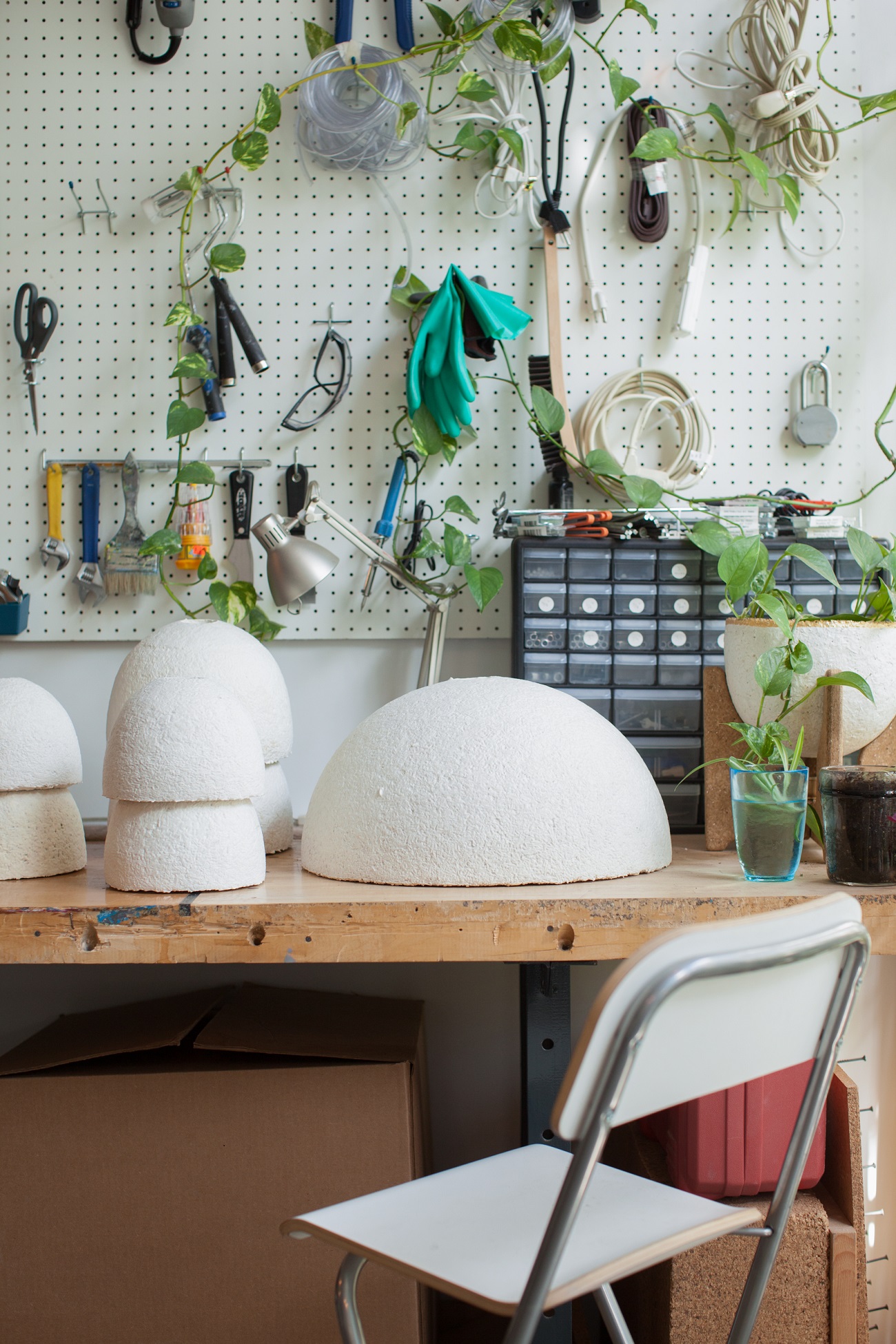 On a gorgeous, unseasonably balmy May day, we visited Danielle in Industry City and asked all about the stuff she makes—whether it’s safe for folks with mushroom allergies (yes), whether it’ll fall apart if you get water on it (not right away, but don’t pour water on a lamp, please), whether you can eat it (technically you could, but again, please don’t), and more. Read on for our full Q&A, plus more photos of Danielle’s stunning space.