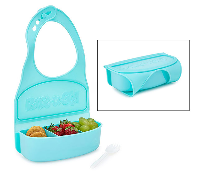Little tummies get hungry, even when out on summer adventures. This bib serves as a handy snack storage container, then unfolds to do the more traditional bib thing.