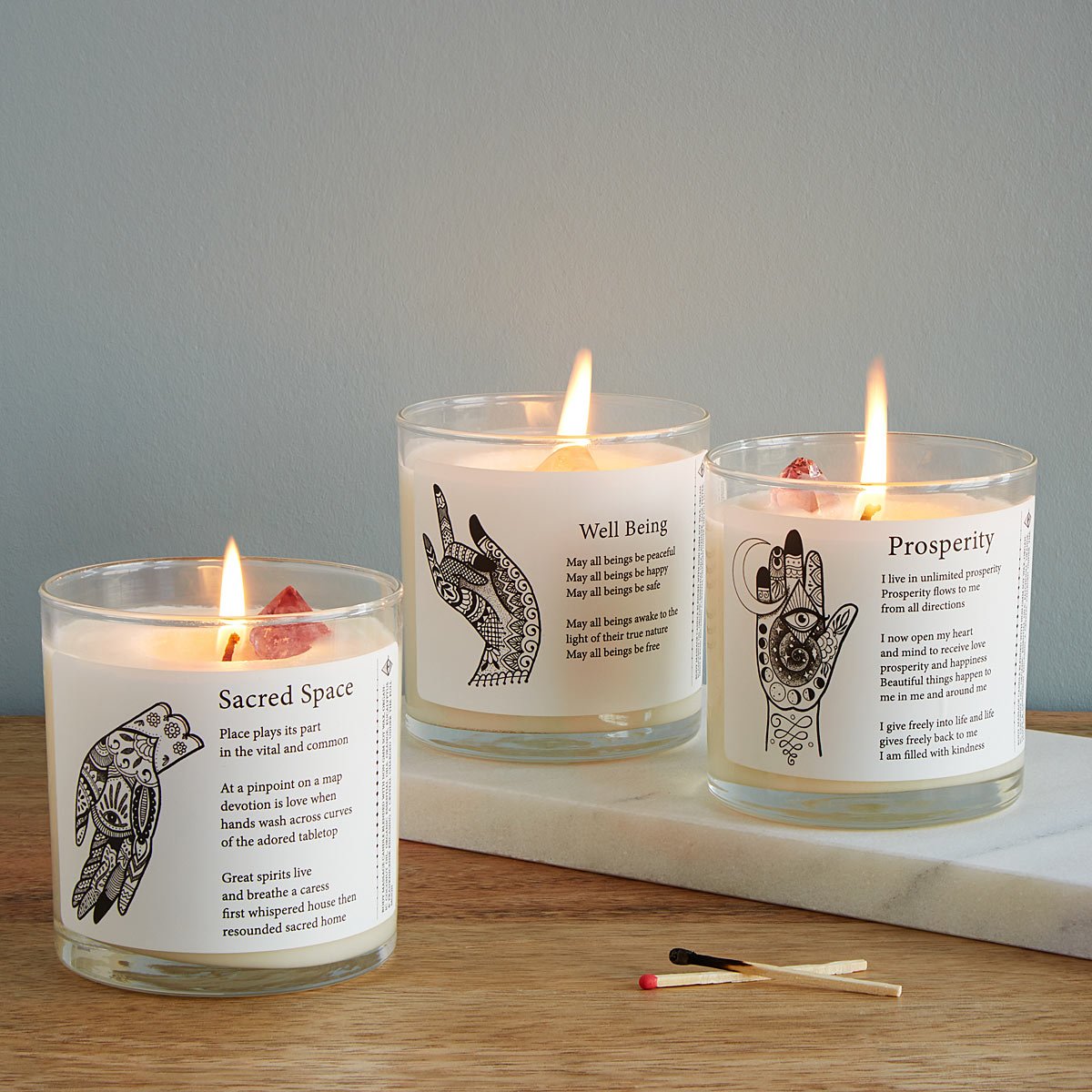 A zen trifecta: essential oils, gemstones and affirmations printed on each.