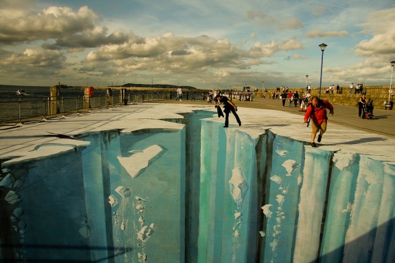More recently a modern and reversed version of di sotto in su has emerged in urban environments that are making passers-by look down. Artists are creating 3D images on the sidewalk in chalk and paint to deceive city dwellers into the thinking the ground beneath them has opened up.