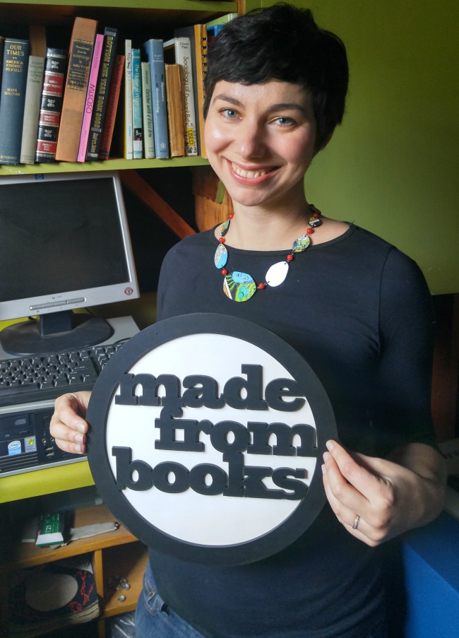 Enter Laura Bruland Shields. A long-time book-lover herself and an artist at heart, she’s taken on this wasteful problem and is making beautiful solutions every day – in the form of one-of-a-kind, laser cut accessories made directly from books that would otherwise be thrown away. On top of that, she takes a portion of the proceeds from her business and donates them to benefit literacy and girls’ education around the world.